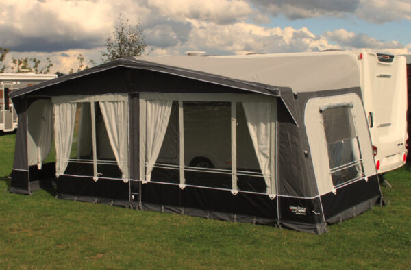 Optional air annexes can be fitted on either side to expand sleeping or storage capacity, making this awning ideal for families or longer stays. Available in sizes 6 to 21 with a 240 cm depth, finished in a smart Dark Grey/Light Grey colour scheme.