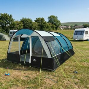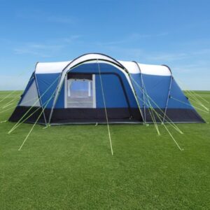 Made from Ace-Tech 75D material with a 6,000 mm Hydrostatic Head for weather resistance. Its extra-wide front door, built-in curtains, and sewn-in groundsheet allow convenience and privacy, while the steel and fiberglass frame provide stability.